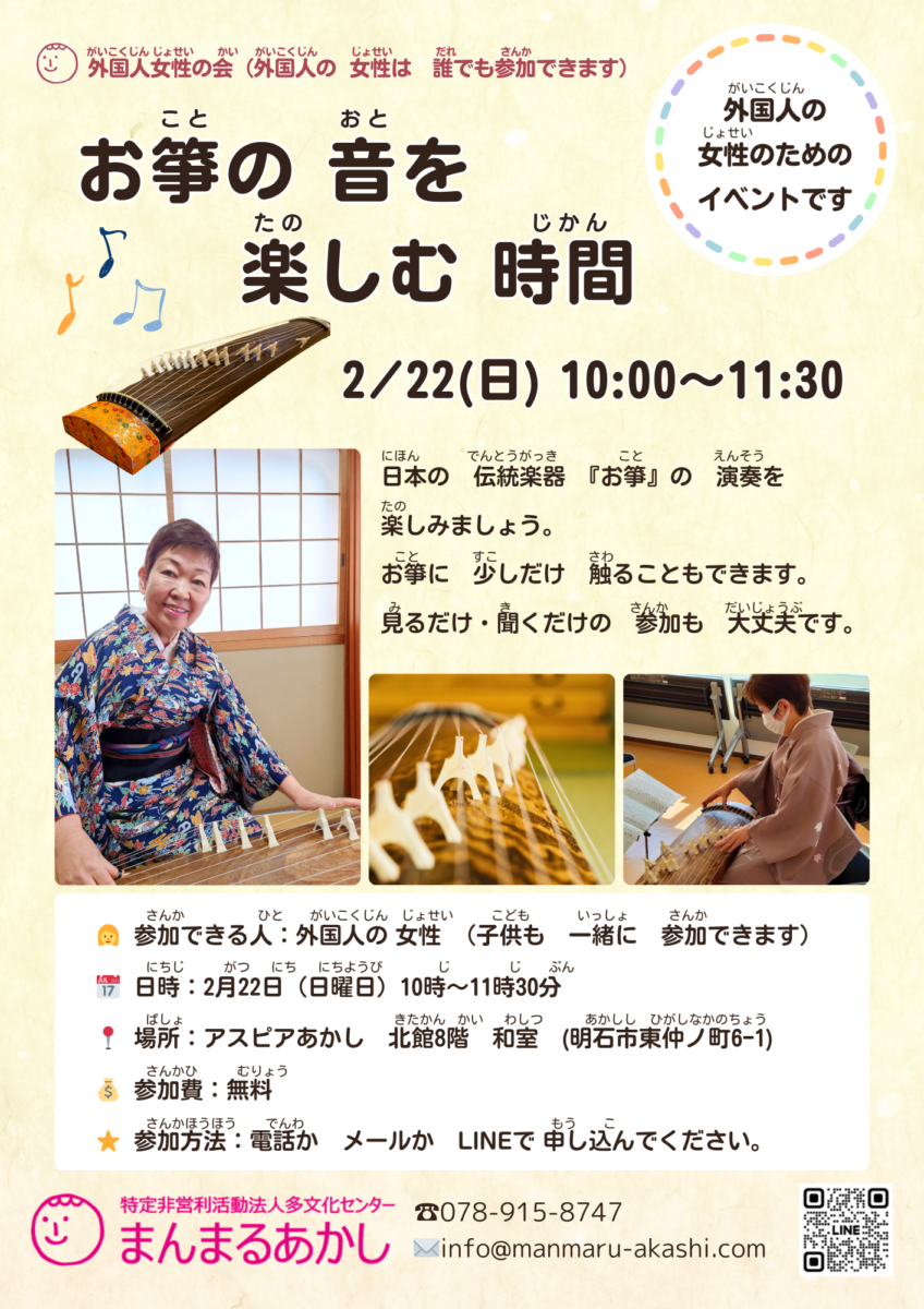 ★2月22日 外国人女性の会のお知らせです★2月の外国人女性の会は、日本の伝統楽器「お箏」を楽しみましょう。明るく楽しい先生が、お箏の演奏と解説をしてくれます。演奏を聴いた後は、参加者がお箏を触ることができる時間も設ける予定です。自分の指... -