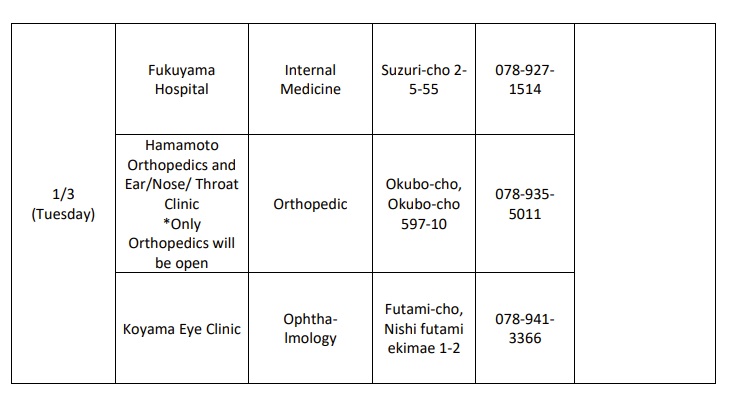- The hospitals which will stay open during the holidays may change. Please confirm this information at the Akashi Medical Association website.