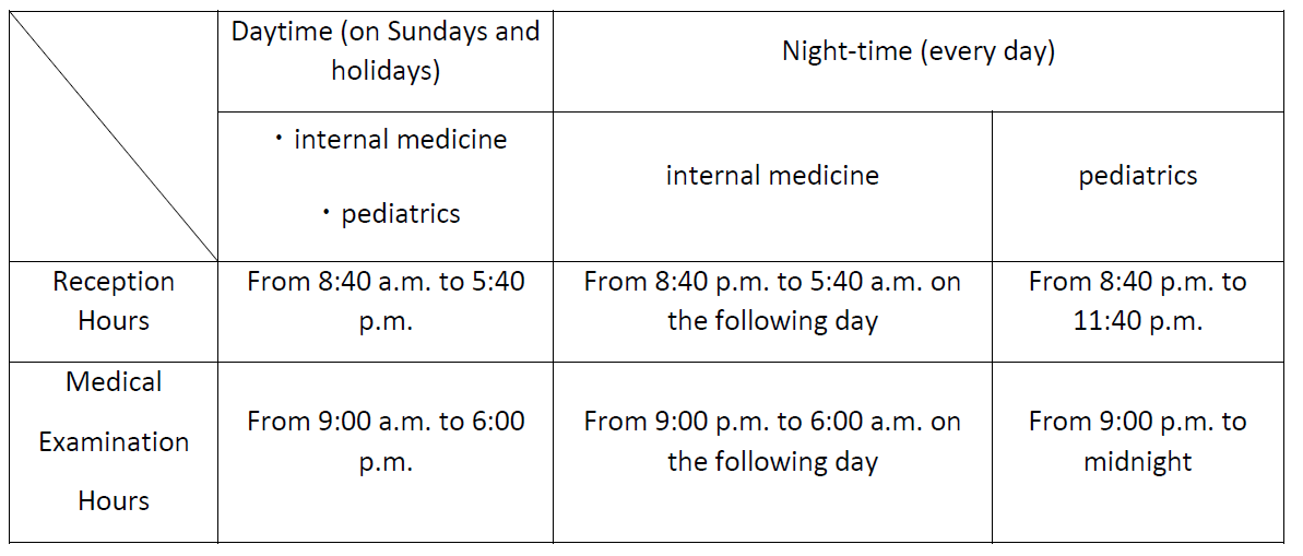 From April 1st of this year, the Night-time/Emergency Medical Clinic will also have set reception hours. Please check the chart below to see what the reception hours will be.