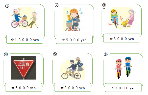 Starting from April 1st, there will be fines if you break various bicycle riding safety rules. These fines will apply to all cyclists who are 16 years old or older. The amount of the fine will change depending on what rule was broken. You can see several examples below. (☆= the cost of the fine in yen)