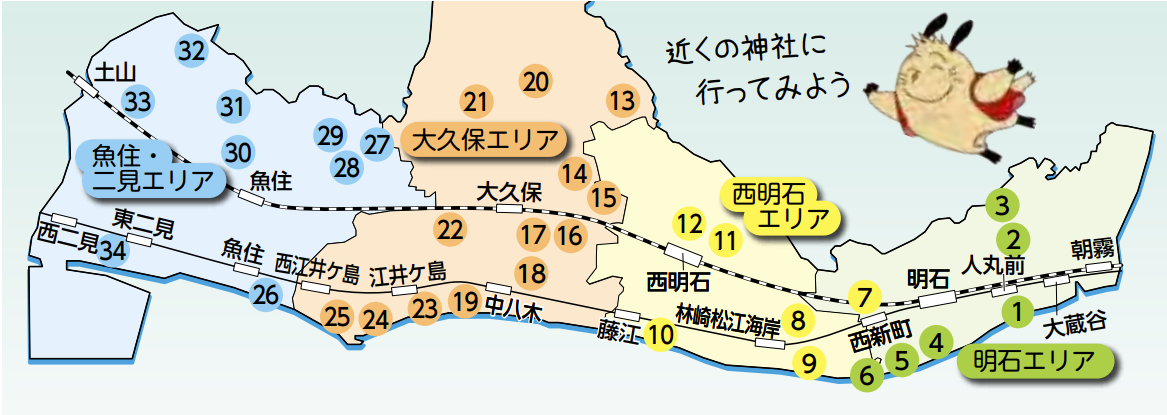 In October, 34 shrines all over Akashi will be holding festivals. Over 20 of those shrines will feature the traditional “futon daiko.” The shrines that will have a futon daiko and the times when you can see them are listed below.