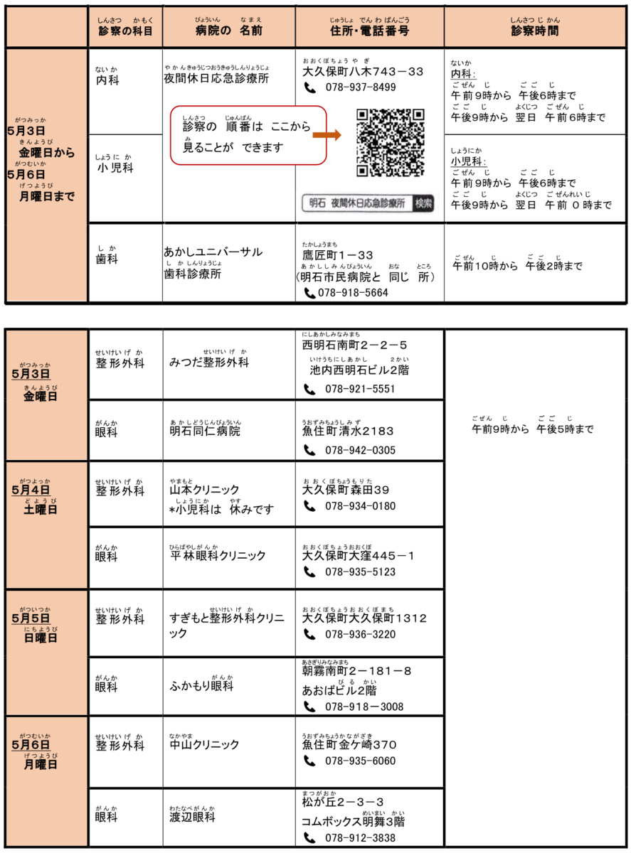 5月の 祝日に 診察を 受けることが できる 病院の お知らせ