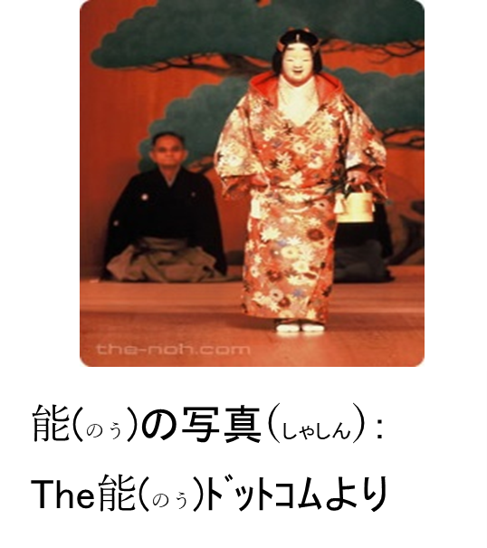 「能」は 日本の 伝統芸能です。顔に 面を つけた 役者が 美しい 着物を