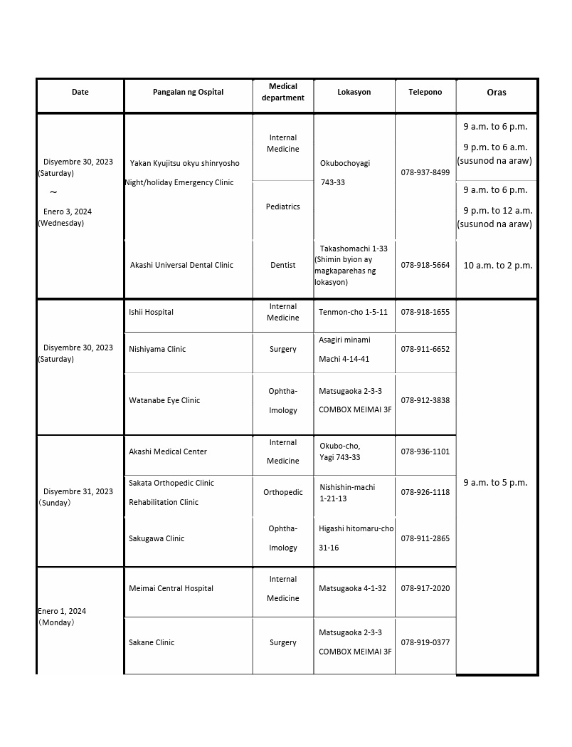 • Maaaring magbago ang listahan ng mga bukas na ospital, kung kaya’t i-check ito sa website ng Akashi City Medical Association.