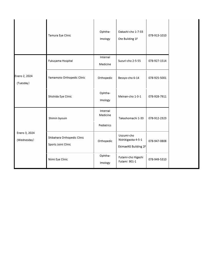• Para sa mga nais magpatingin ng kanilang tenga, ilong at lalamunan, tawagan ang mga sumusunod: Night and Holiday Emergency Clinic (telepono: 078-937-8499, Fax number: 078-937-8400)