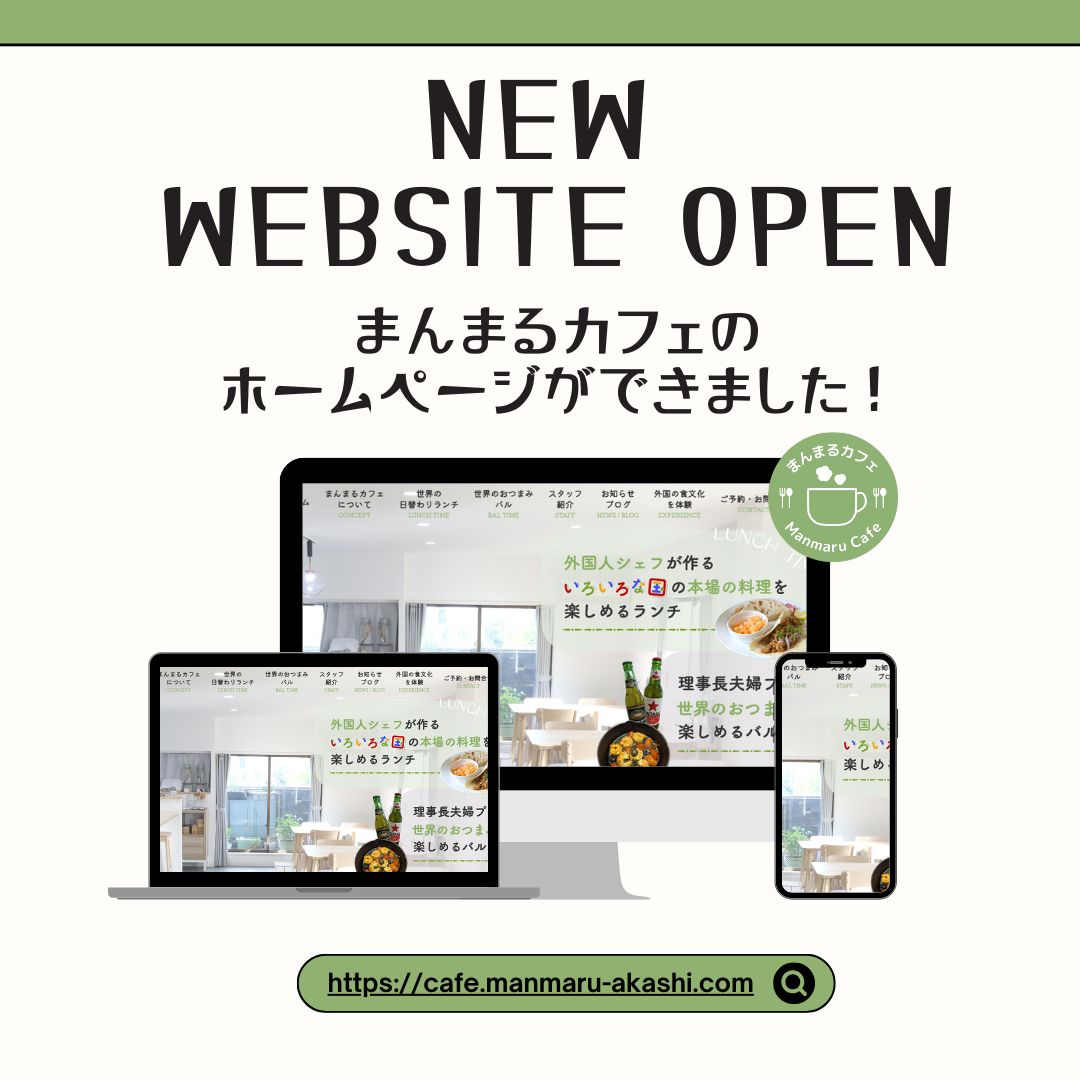 そして、このホームページは、まんまるカフェだけではなく、地域の外国人オーナーのお店や、外国食材、物品などの販売店の情報も掲載しています。明石の食材を使った外国料理店の情報も随時公開していきます!