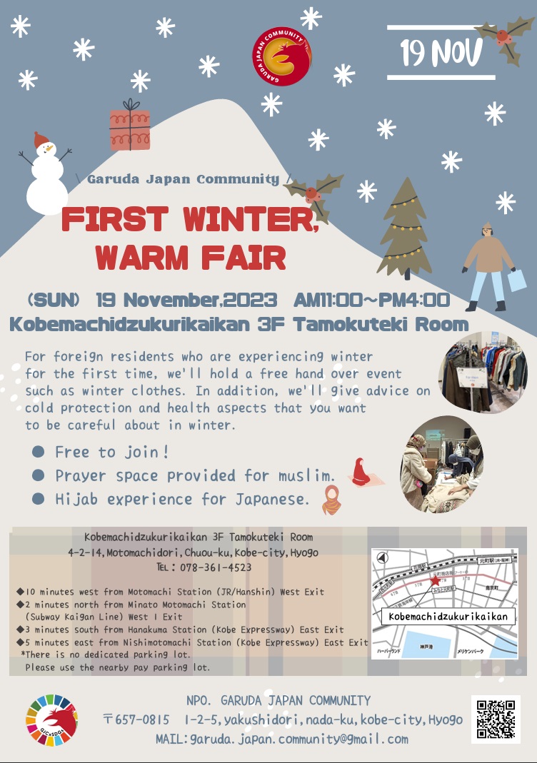 初めての冬、あったかフェア 2023 11/13 イベント 11月19日 11時~16時 こうべまちづくり会館 初めての冬を経験する在留外国人の方々に、冬服などを無償譲渡する会があります。 会場:あかし市民広場 イベント よかったらシェアしてね! URL Copied! URL Copied! みらいのきょうしつ~支援ボランティア募集! まんまるあかし映画クラブ 関連記事 外国人ママの会 2022.11.12 外国人女性の会「ヨガ体験」 2025.12.18 外国人女性の会「織物をしよう!」 2025.10.21 外国にルーツをも持つ児童生徒への日本語・教科学習支援ボランティア養成講座受講生募集 2025.12.02 外国人のための生活相談会 2023.11.08 プチワールドフェスタがあります! 2023.08.23 外国人女性の会「牛乳の泡でかわいいコーヒーを作ります」 2025.09.30 世界のことばであそぼう! 2025.12.31