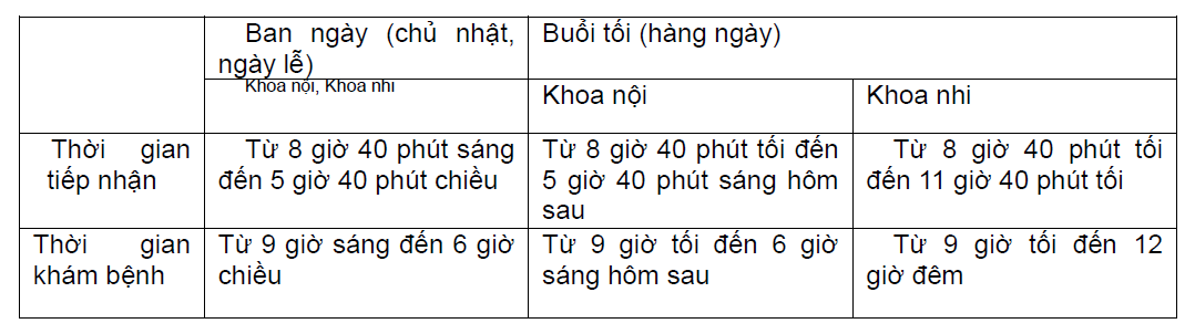 “Cơ sở cấp cứu ban đêm ngày lễ” là bệnh viện khám chữa vào buổi đêm tối hay ngày nghỉ. Cho đến nay, thời gian khám chữa luôn được quy định nhưng thời gian tiếp nhận thì chưa được quy định. Từ ngày 1 tháng 4 năm nay thì thời gian tiếp nhận sẽ được quy định như sau.